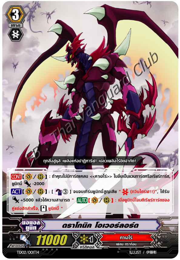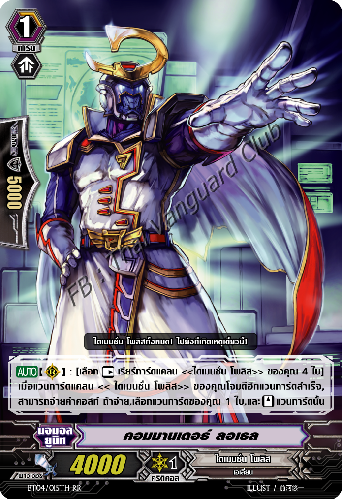 แก้ไขเป็น AUTO [RC] GB1 [CB 1] เมื่อเรียร์การ์ดคู่แข่งถูกนำกลับเข้ากองการ์ดตัวเองด้วยความสามารถของการ์ดคุณ , สามารถจ่ายคอสท์ ถ้าจ่าย , จนจบเทิร์น , ยูนิทนี้ได้รับความสามารถ " AUTO [RC] เมื่อยูนิทนี้โจมตีแวนการ์ด , จนจบการต่อสู้ , คู่แข่งไม่สามารถคอลการ์ดเกรด 0 จากมือลงช่อง GC ได้ " CONT [VG/RC/GC] ต้านทาน