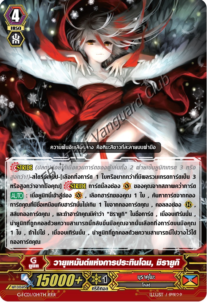 G-FC01/014TH วายุเหมันต์แห่งการประทินโฉม,ชิรายูกิแก้ไขเป็น AUTO@: เมื่อยูนิทนี้เข้าสู่ช่อง VC@ , เลือกฮาร์ทของคุณ 1 ใบ , ค้นหาการ์ดจากกองการ์ดคุณที่มีชื่อเหมือนกับฮาร์ทนั้นไม่เกิน 1 ใบจากกองการ์ดคุณ , คอลลงช่อง RC@ , สลับกองการ์ดคุณ , และถ้าฮาร์ทคุณมีคำว่า "ชิรายูกิ" ในชื่อการ์ด , เมื่อจบเทิร์นนั้น , นำยูนิทที่ถูกคอลด้วยความสามารถนี้กลับขึ้นมือคุณจากนั้นเลือกทิ้งการ์ดบนมือคุณ 1 ใบ , ถ้าคุณไม่ทำ , เมื่อจบเทิร์นนั้น , นำยูนิทที่ถูกคอลด้วยความสามารถนี้ไปไว้ใต้กองการ์ดคุณ